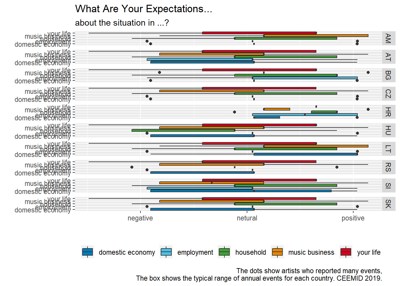 In Austria musicians usually have a more positive view about the music scene than the country in general. Our survey was conducted during a political crisis, which may negatively affect the view on the country itself – but nevertheless, Austria is the country where at least half of the musicians have a positive view about their music scene. In most countries, the musicians believe that the things in the music scene are going worse than in the country in general, except for Czechia and Slovakia, where generally musicians have a negative view on both the country and the music scene.