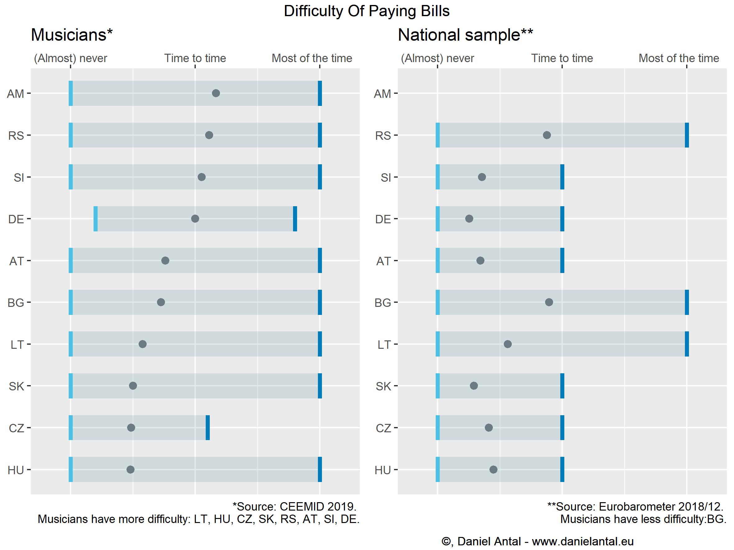 Musicians everywhere, including rich countries like Germany, Austria and Slovenia have more problems with paying their bills than the general population in their countries. The only seemingly different country is Bulgaria, but in this case, the self-reported difference is small, and generally Bulgarian musicians and other Bulgarian people have similarly frequent difficulties with paying their bills.