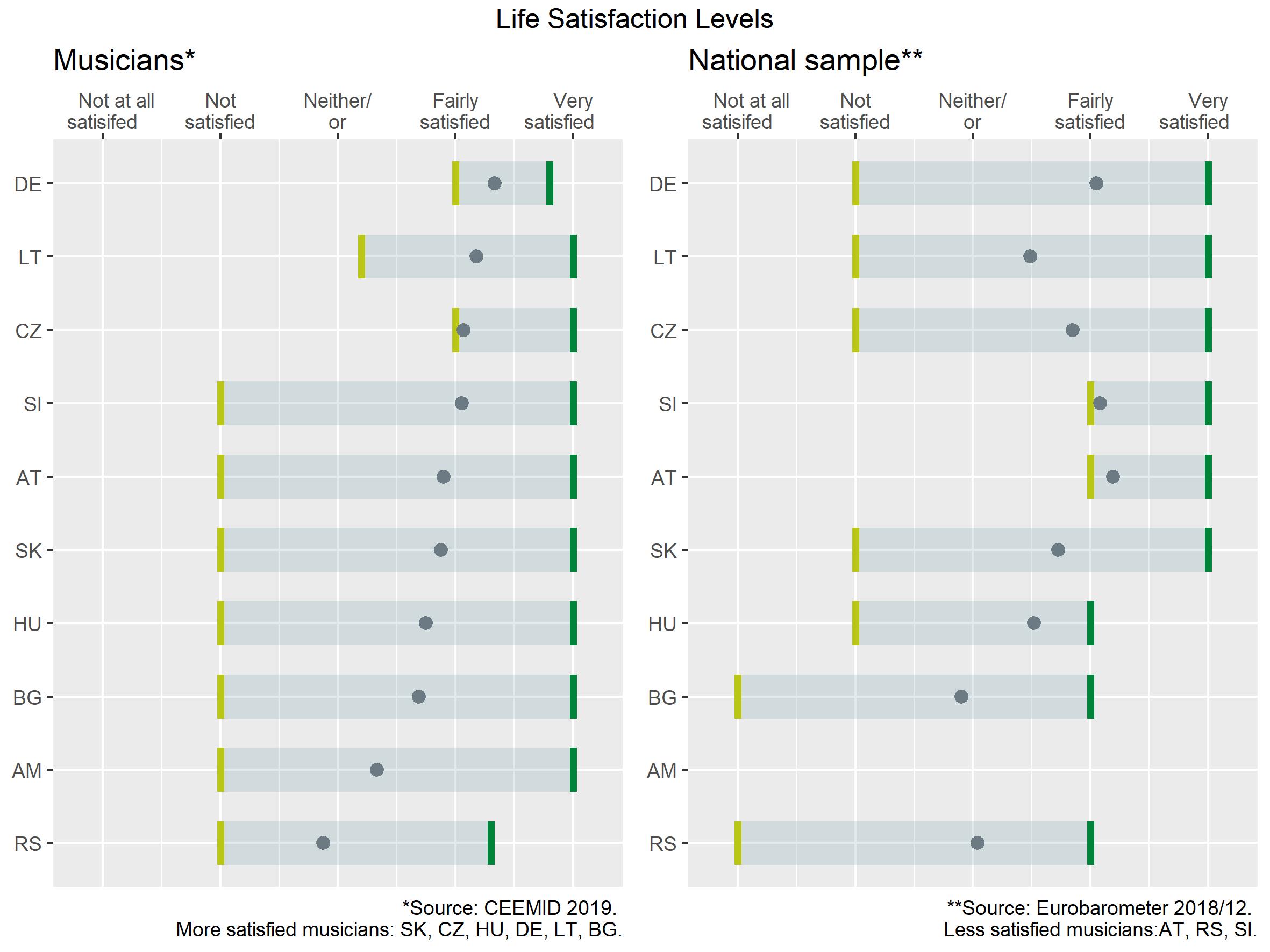 To avoid the bias of higher satisfaction levels in richer environments, we measure musician’s self-reported life satisfaction levels against the national averages from the 2018/11 Eurobarometer sample, scaled between the numerical values of -2 (not at all satisfied) to 2 (very satisfied).