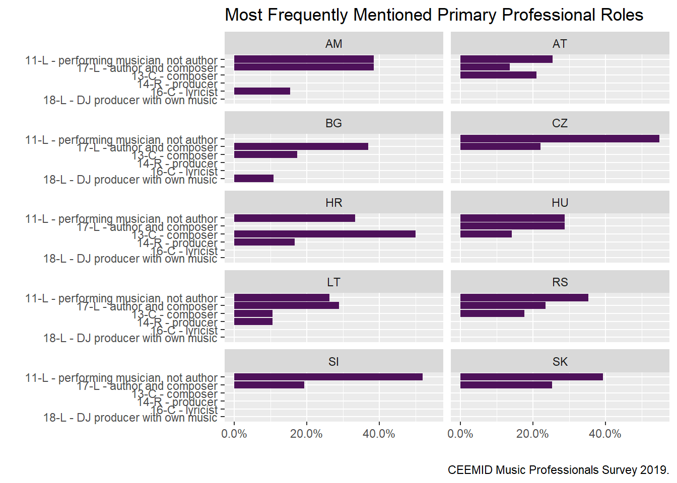 While each year we make efforts to include technicians, educators, journalists and managers in our panel, the primary targets are musicians. The composition of the most frequently mentioned primary roles in 8 countries is shown below.